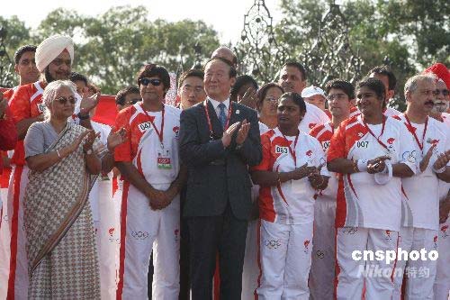 4月17日下午,北京奧運(yùn)圣火傳遞活動(dòng)在新德里印度總統(tǒng)府和印度門之間的拉吉大街上進(jìn)行。70名火炬手沿著這條三公里長的大街傳遞圣火。圖為北京奧組委執(zhí)行副主席蔣效愚出席北京奧運(yùn)圣火新德里傳遞起跑儀式。作者: 沈晨