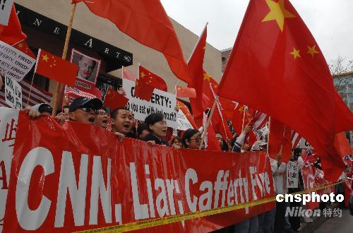當(dāng)?shù)貢r(shí)間4月19日,洛杉磯爆發(fā)十幾年來最大規(guī)模的華人華僑抗議示威活動(dòng)。數(shù)千名華人華僑和留學(xué)生在CNN洛杉磯分部門前參加和平示威,要求CNN向公開鄭重道歉,并開除卡弗蒂。除了中國(guó)大陸籍華人華僑外,很多來自越、柬、寮和印尼等國(guó)的旅美華人華僑、香港和臺(tái)灣籍僑民和留學(xué)生也加入到抗議隊(duì)伍中。中新社發(fā) 張煒 攝