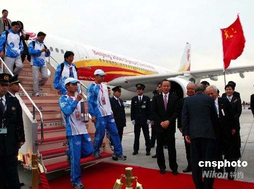 圣火受到了前來迎接的國際奧委會日籍副主席豬谷千春和日本奧委會副會長遲塚研一、中國駐日大使崔天凱等人的熱烈歡迎。中新社發(fā) 侯宇 攝