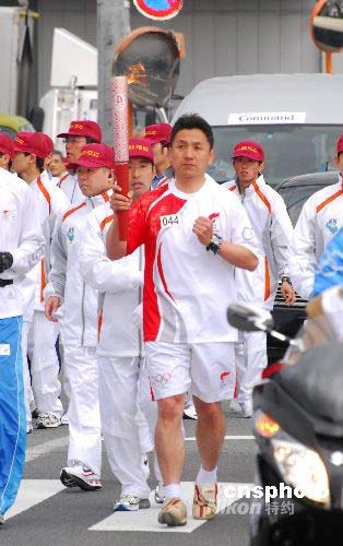 圖為日本民間少年足球隊教練松本賢一郎進行火炬接力。 中新社發(fā) 侯宇 攝