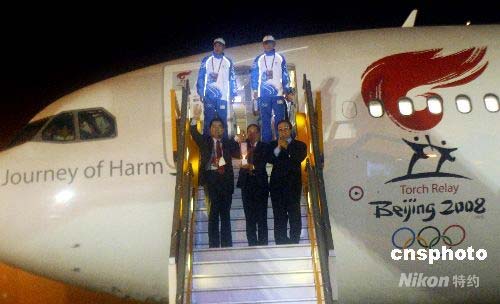 4月28日晚10時(shí)57分,載著北京奧運(yùn)圣火的“奧運(yùn)圣火號(hào)”抵達(dá)“和諧之旅”海外傳遞第十九站——越南的胡志明市。北京奧運(yùn)圣火在胡志明市的傳遞將于29日晚6時(shí)開始,從位于該市中心的大劇院出發(fā),經(jīng)過多處著名地標(biāo)后,抵達(dá)設(shè)在終點(diǎn)第七軍區(qū)體育館,全程長(zhǎng)約十多公里。圖為北京奧組委執(zhí)行副主席李炳華(中)手持圣火燈走下飛機(jī)。 中新社發(fā) 沈晨 攝