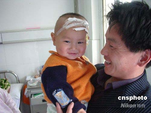 4月29日,阜陽市第二人民醫(yī)院,家長抱著已脫離生命危險的患兒在病房內(nèi)笑逐顏開。家住安徽省阜陽市潁泉區(qū)蘇屯鄉(xiāng)孟寨大隊1歲患兒劉暢,4月17日因發(fā)熱伴手足皮疹入住該醫(yī)院,當時病情很嚴重,經(jīng)醫(yī)院專家會診調(diào)整治療方案,目前病情穩(wěn)定。4月29日上午,安徽省衛(wèi)生廳副廳長杜昌智在通報會上說,目前阜陽共報告腸道病毒EV71感染病例1520例,其中痊愈585例,經(jīng)全力搶救無效死亡20例,仍在住院治療412例,其中重癥患者26例。中新社發(fā) 張婭子 攝