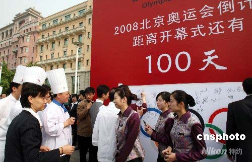 北京飯店千名員工,以及天安門國旗護衛(wèi)隊、中國人民解放軍軍樂團參加迎奧運倒計時100天千人簽字活動。中新社發(fā) 錢興強 攝