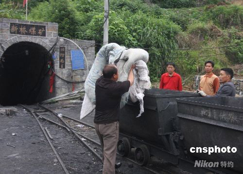 搶險(xiǎn)隊(duì)員準(zhǔn)備搶險(xiǎn)物質(zhì)到發(fā)生煤與瓦斯突出事故的漣源市安平鎮(zhèn)新橋煤礦進(jìn)行搶救。中新社發(fā) 郭國(guó)權(quán) 攝