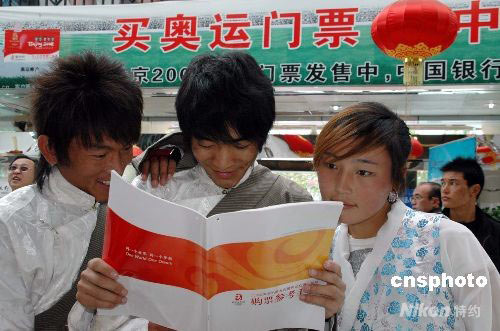 5月5日上午,北京奧運(yùn)會第三階段門票開始在拉薩銷售,該銷售工作與全國同步進(jìn)行。奧運(yùn)會門票的銷售,引起了拉薩市民的極大熱情。在西藏奧運(yùn)會門票銷售點(diǎn)的中國銀行西藏自治區(qū)分行里,購買奧運(yùn)會門票的市民排起了長長的隊(duì)伍。圖為西藏大學(xué)的學(xué)生在看購票參考手冊。 中新社發(fā) 周波 攝