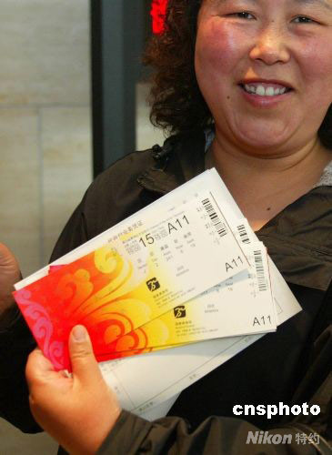 5月5日,北京奧運(yùn)會(huì)第三階段門票銷售正式啟動(dòng)。由于這一階段采取“先到先得”的售票原則,公眾購(gòu)票熱情十分高漲。據(jù)奧運(yùn)票務(wù)中心統(tǒng)計(jì),截至當(dāng)日上午11時(shí)40分,男足半決賽和決賽、男子110米欄半決賽、男籃預(yù)賽等8個(gè)場(chǎng)次的門票已售罄。第三階段銷售將投放奧運(yùn)門票138萬(wàn)張,涵蓋16個(gè)大項(xiàng)的244個(gè)比賽場(chǎng)次。圖為北京一位民眾買到票后異常高興。 中新社發(fā) 富田 攝