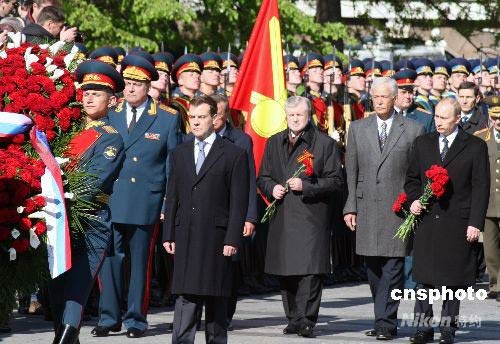 5月8日上午,俄羅斯新任總統(tǒng)梅德韋杰夫來到克里姆林宮西北側(cè)紅墻下的亞歷山大花園,向無名烈士墓敬獻花圈,紀念衛(wèi)國戰(zhàn)爭勝利63周年。俄前任總統(tǒng)普京、看守總理祖布科夫、議會兩院議長米羅諾夫和格雷茲洛夫等高官政要參加了儀式。這是梅德韋杰夫就任總統(tǒng)后的首場正式活動。中新社發(fā) 田冰 攝