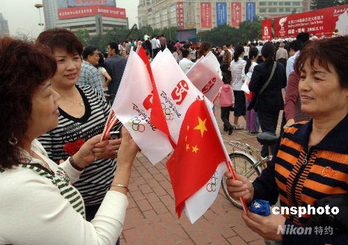 5月10日,三名專程返榕的旅美福州鄉(xiāng)親在福州五一廣場相互分發(fā)五星紅旗和北京奧運(yùn)會(huì)會(huì)徽旗,準(zhǔn)備在5月11日奧運(yùn)圣火在福州進(jìn)行傳遞時(shí)為火炬手歡呼加油。中新社發(fā) 劉可耕 攝