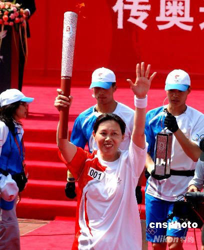 福建籍的奧運冠軍、中國女排名將鄭美珠跑出奧運圣火福建傳遞首站福州站的第一棒。中新社發(fā) 劉可耕 攝