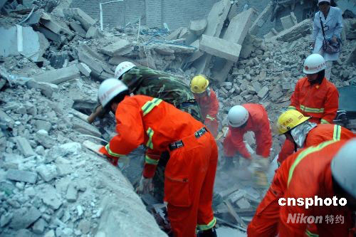 十二日下午兩點(diǎn)三十分左右,受四川汶川地震波及,重慶市梁平縣文化鎮(zhèn)一小學(xué)教學(xué)樓發(fā)生垮塌,目前已造成五名學(xué)生死亡,三十六人受傷。圖為消防隊(duì)員正在對被掩埋學(xué)生進(jìn)行搜救。 中新社發(fā) 郭晉嘉 攝
