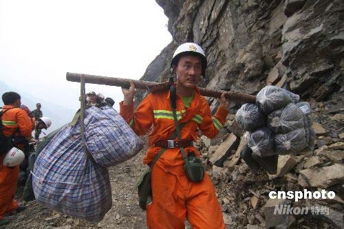 經(jīng)過(guò)水路運(yùn)輸,武警步行十多公里將救災(zāi)物資肩挑背扛運(yùn)送到汶川縣映秀鎮(zhèn)。中新社發(fā) 郭國(guó)權(quán) 攝