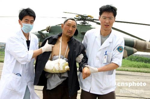 5月18日11時35分,一架軍用直升機載著11名臺灣游客,從四川汶川起飛,于12時許平安抵達成都鳳凰山機場。他們是臺灣祥鶴旅行社14人游客團中脫困的首批游客,另3人將于下午搭乘另一架直升機脫離險境。圖為救護人員攙扶臺灣游客上車。中新社發(fā) 楊杰 攝