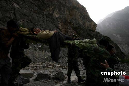 成都軍區(qū)駐渝某集團軍紅軍師步兵團翻山越嶺解救汶川大地震茂縣羌寨兩位女傷員,傍晚成功送到前來支援的解放軍第二軍醫(yī)大學(xué)醫(yī)療隊。中新社發(fā) 賈國榮 攝