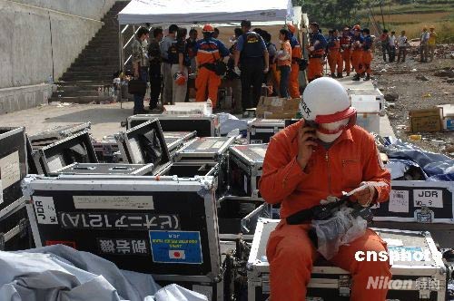 5月18日,日本國際救援隊(duì)一行二十余人到達(dá)中國四川北川地震現(xiàn)場——北川中學(xué),利用國際先進(jìn)的探測儀器與中國兩支救援隊(duì)分別挖掘廢墟,救援受難學(xué)生。經(jīng)過共同探測,在沉入地下的樓層內(nèi)發(fā)現(xiàn)有三個(gè)生物體存在,但挖掘極為危險(xiǎn)和困難,生者生命渺茫。圖為日本救援隊(duì)成員在休息時(shí)依然思考救援問題。中新社發(fā) 鄒憲 攝