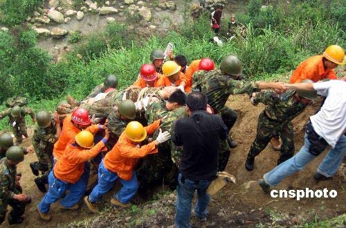 16日上午,師政治部主任高鵬帶領(lǐng)救援突擊隊和醫(yī)療小分隊172人,從綿竹市漢旺鎮(zhèn)出發(fā)向重災(zāi)區(qū)天池鄉(xiāng)幾個村里運送救援物資,幫助群眾撤離震區(qū)。11時左右,當部隊行至高橋以西500米處,突然發(fā)生余震,導致大量山石從山頂傾斜而下,直接威脅著正在這個路段通過的群眾。作訓參謀祝紅杰突然發(fā)現(xiàn)一個孩子癱倒在石堆上,急忙上前搶抱他,孩子得救了,祝紅杰卻被亂石砸斷左腿,當場倒地。作訓參謀胡國才眼見一塊亂石砸向老人,極力將老人推到一邊,自己的頭部卻被亂石砸傷暈倒在地。同時,該團還有一名司務(wù)長和兩名戰(zhàn)士在救援中被泥石流砸傷…… 看到解放軍為救災(zāi)區(qū)群眾身負重傷,在現(xiàn)場的一些救災(zāi)志愿者迅即投入搶救部隊官兵的行動中。運送途中山路險峻,他們拉一把、推一把,爭先恐后出把力氣。擔負救援撤離群眾任務(wù)的重慶市高新區(qū)人民醫(yī)院的醫(yī)護人員聞訊后,一邊流著熱淚,一邊實施現(xiàn)場救護,為他們贏得了寶貴的救治時機……