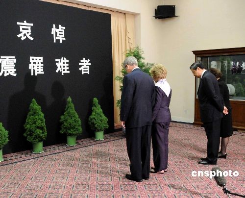 圖為布什夫婦在周文重大使夫婦陪同下在中國(guó)大使館向地震遇難者默哀。中新社發(fā) 邱江波 攝