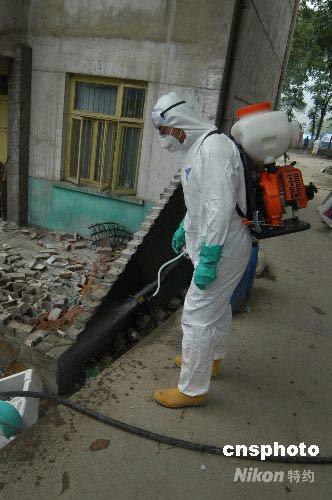 防疫人員在對北川中學(xué)教師宿舍樓消毒。中新社發(fā) 成和平 攝