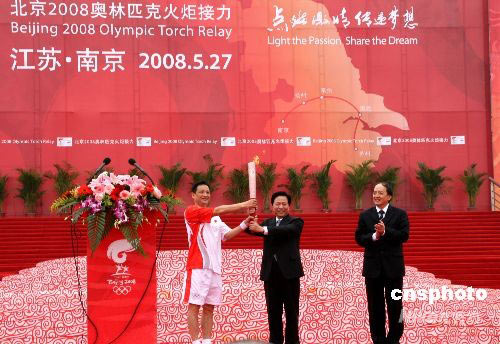 5月27日,奧運會火炬?zhèn)鬟f活動來到江蘇省省會、六朝古都南京。擔任南京站傳遞活動第一棒火炬手是羽毛球名將楊陽,早上8點他從江蘇省委書記梁保華手中接過“祥云”火炬,拉開了南京站傳遞序幕。 中新社發(fā) 崔佳明 攝