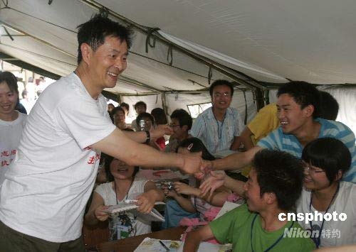 5月26日,濮存昕、林志穎、王寶強(qiáng)等藝人前往地震重災(zāi)區(qū)什邡市一中學(xué)帳篷教室看望復(fù)課學(xué)生。這些藝人是參與由中國(guó)扶貧基金會(huì)主辦的“5·12青少年關(guān)愛基金——明星義工行動(dòng)”的第一批明星義工。經(jīng)歷過(guò)臺(tái)灣9·21大地震的林志穎作為臺(tái)灣第一位親赴內(nèi)地參加賑災(zāi)行動(dòng)的藝人,認(rèn)為災(zāi)區(qū)的小朋友是最需要幫助的人。中新社發(fā) 張曉理 攝