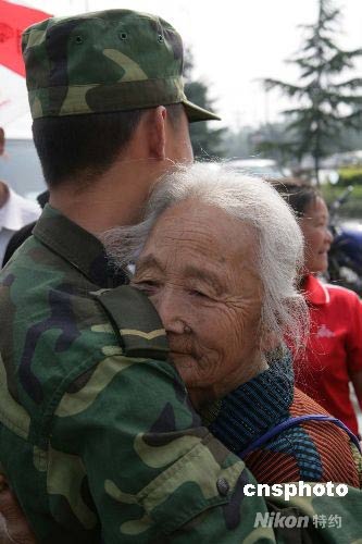 5月31日上午9時,在四川都江堰市海蓉藥業(yè)公司門口,濟南軍區(qū)某工兵團的43名都江堰籍抗災官兵在部隊轉場之際與他們的親人做30分鐘的短暫團聚。