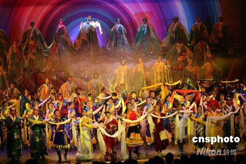 5月31日晚,西藏自治區(qū)文藝界舉行《幸福在路上》主題匯演,此系四川大地震后西藏首場大型演出,雪域兒女以吉祥哈達祝福祖國、祝福四川、祝福北京奧運會。中新社發(fā) 賈長飛 攝