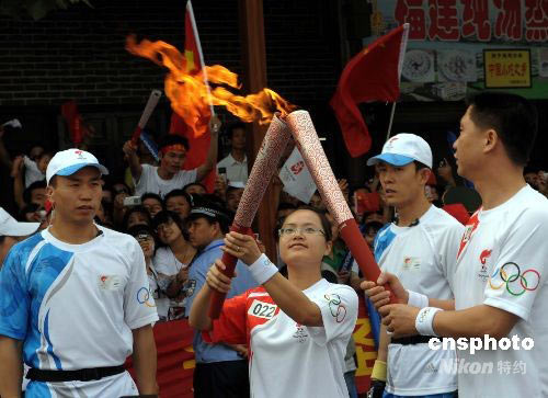 圖為22號火炬手點燃“祥云”火炬。中新社發(fā) 廖攀 攝