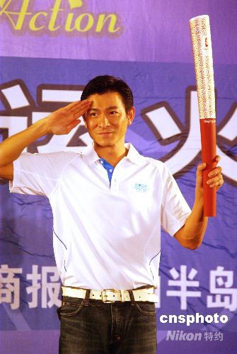 6月3日,在海南三亞進行的“愛心呵護 陽光行動”愛心大使奧運火炬義拍活動中,香港藝人劉德華拿出自己在香港傳遞奧運圣火時的奧運火炬進行現(xiàn)場義拍,拍得人民幣190萬元,拍賣所得將全部用于四川地震災區(qū)教育事業(yè)。圖為劉德華在展示自己的奧運火炬。中新社發(fā) 尹海明 攝
