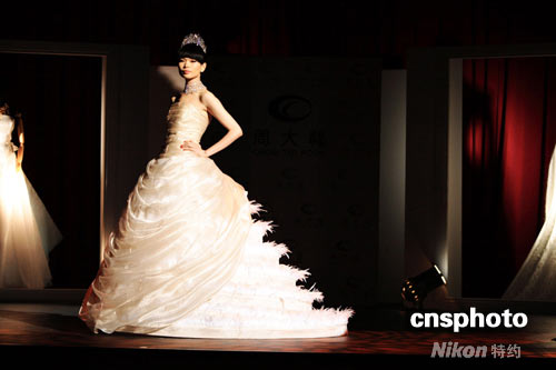 周大!拔艚.飾金”珠寶藝術(shù)展覽近日在香港文化博物館劇院舉辦了隆重的揭幕典禮。代言人呂燕與樂基兒、林嘉綺三位中港臺頂尖名模,身著奧斯卡美術(shù)指導(dǎo)獎得主葉錦添先生設(shè)計(jì)的配套婚紗,傾情演繹了周大福最新婚嫁珠寶作品。葉錦添先生從各自獨(dú)特的角度,通過婚嫁首飾與婚紗這兩種重要的婚禮元素,闡述著他們對于現(xiàn)代女性復(fù)雜而多變的情感世界的理解與領(lǐng)悟,表達(dá)出新人對美麗與幸福的無限憧憬與期冀。 中新社發(fā) 楊影懿 攝