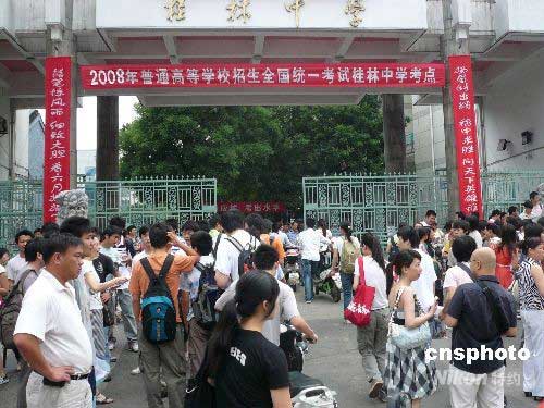 全國高考第一天,桂林中學(xué)高考點。2008年廣西高考報名人數(shù)30萬3778人,首次突破30萬人,比2007年增長3.20%。中新社發(fā) 周利朔 攝