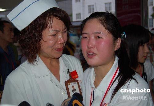 來自四川綿陽的傷員劉小紅與照顧她的一名護士灑淚分別。中新社發(fā) 劉萬強 攝