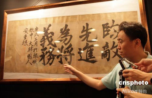 預(yù)展中,一幅紙質(zhì)黃舊的書法作品——“臨敵先進(jìn),為將義務(wù)”吸引眾人的眼球,這是當(dāng)年刺殺伊藤博文的韓國(guó)民族英雄安重根在獄中的絕筆書。圖為工作人員講解這幅書法作品的歷史價(jià)值。中新社發(fā) 趙雋 攝