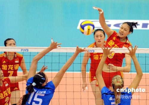 六月二十九日,中國女排在香港舉行的“世界女排大獎賽香港站”上, 以三比二險勝意大利,登上冠軍寶座。圖為中國女排選手趙蕊蕊大力扣殺。中新社發(fā) 洪少葵 攝