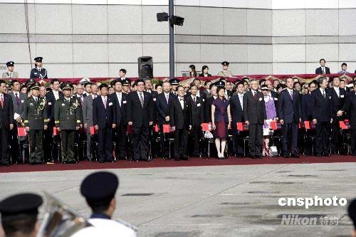 香港特區(qū)行政長官曾蔭權(quán)及特區(qū)政府官員、中央駐港聯(lián)絡(luò)辦公室、外交部駐港特派員公署、駐港部隊及眾多民眾參加升旗儀式。中新社發(fā) 王麗南 攝