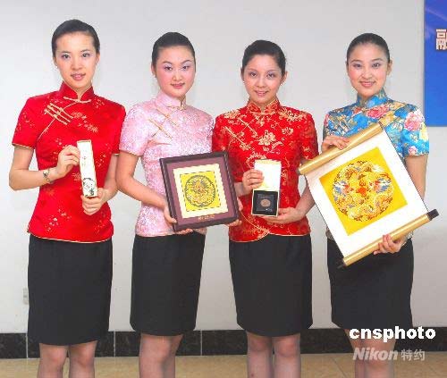 南京首航兩岸周末包機“神秘小禮物”揭曉,包括南京特有石頭雨花石所做成的擺設(shè)品、手鏈和鑰匙扣以及“工藝之寶”云錦!吧韮r不菲”的南京云錦卷軸掛畫可能會饋贈給頭等艙旅客。中新社發(fā) 王浩 攝