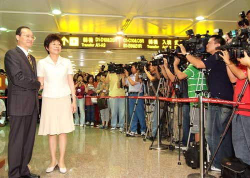 由海峽兩岸旅游交流協(xié)會會長邵琪偉率領(lǐng)的大陸居民赴臺旅游(北京)首發(fā)團(tuán)4日中午12時20分許乘國航包機(jī)抵達(dá)臺北桃園機(jī)場。臺灣海峽兩岸觀光旅游協(xié)會(臺旅會)會長賴瑟珍(右)到桃園機(jī)場迎接邵琪偉一行。(“中央社”圖)