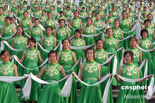 7月8日,奧運火炬在內蒙古呼和浩特市進行傳遞。在傳遞起點的民族團結寶鼎廣場,內蒙少女著盛裝迎接火炬。中新社發(fā) 廖攀 攝
