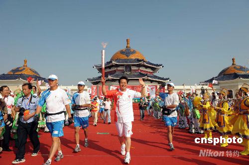 7月9日上午8時(shí)30分左右,隨著首棒火炬手、內(nèi)蒙古獲得殘奧會(huì)金牌第一人哈斯勞高擎“祥云”火炬在成吉思汗陵前跑出第一棒,北京奧運(yùn)火炬在鄂爾多斯的傳遞拉開(kāi)了帷幕。 中新社發(fā) 廖攀 攝