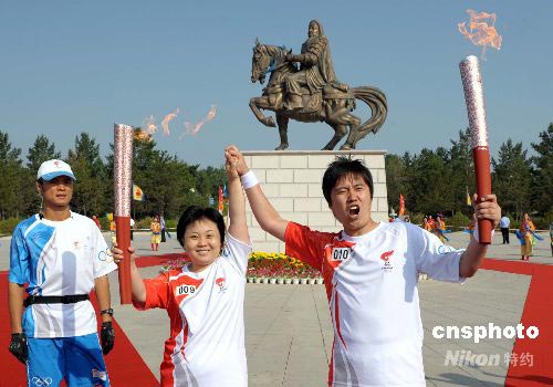 圖:奧運(yùn)火炬在成吉思汗雕像前交接