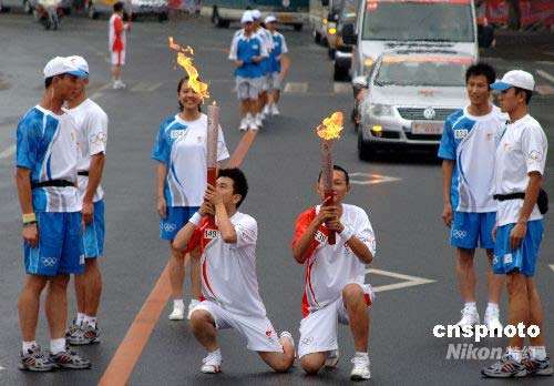 奧運(yùn)火炬吉林市傳遞 火炬手同時(shí)親吻火炬