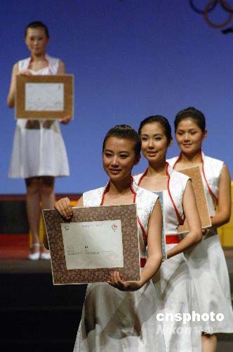 7月17日晚,北京奧運(yùn)頒獎證書在北京正式發(fā)布。圖為奧運(yùn)禮儀志愿者展示證書。中新社發(fā) 王東明 攝