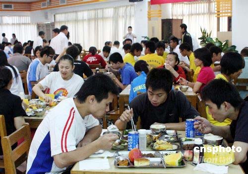 圖為運動員餐廳內(nèi),選手們正享美食,有燉牛肉、蒸雞蛋、炒時蔬,還有各樣水果,中西餐兼?zhèn),葷素搭配,花樣齊全。中新社發(fā) 黃少華 攝