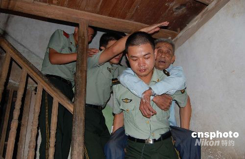 七月二十八日,隨著臺風(fēng)“鳳凰”逼近福建沿海,駐守福建沿海一線的邊防官兵正全力準備,防抗臺風(fēng)襲擊。圖為福建福清江陰鎮(zhèn)東霄村的一棟危房中,當?shù)剡叿琅沙鏊俦岩恍袆硬槐愕睦喜D(zhuǎn)移到安全地帶。中新社發(fā) 朱明海 攝