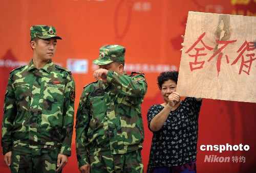 8月5日,奧運(yùn)火炬在四川成都傳遞,在傳遞結(jié)束儀式上四川民眾為抗震官兵舉起“舍不得你們走”的標(biāo)語,抗震官兵感動(dòng)抹淚。 中新社發(fā) 廖攀 攝