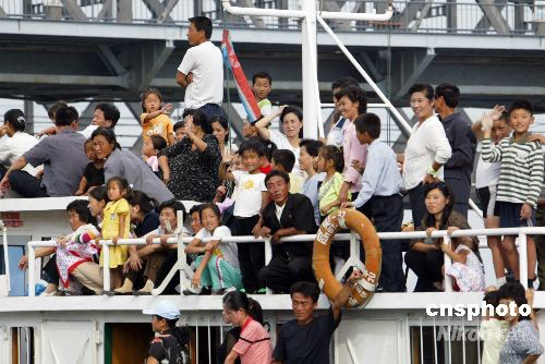 9月9日正值朝鮮國慶,朝鮮新義洲民眾有組織地乘船游覽鴨綠江。中新社發(fā) 陳浩浩 攝