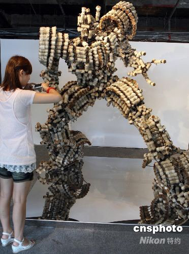 9月9日,上海雙年展國際學(xué)生展在創(chuàng)智天地拉開帷幕,國際學(xué)生展歷來是上海雙年展的主要藝術(shù)活動之一,本次展覽吸引了中外40余所一流設(shè)計院校前來參展。圖為一個由紡織廠廢棄物件組成的“變形金剛”吸引參觀者。中新社發(fā) 湯彥俊 攝