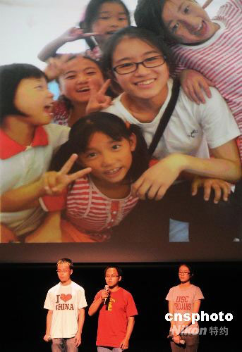 當?shù)貢r間9月20日晚,來自美國西南各地的數(shù)百名中國留學生和學者代表在洛杉磯南加州大學歡聚一堂,舉行“夢圓中華”中秋國慶晚會,迎接中華人民共和國成立59周年。圖為留學生代表在晚會上講述暑期赴四川地震災區(qū)從事志愿活動的經(jīng)歷。中新社發(fā) 張煒 攝