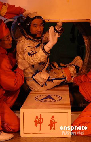 翟志剛進(jìn)入神舟七號飛船返回艙。中新社發(fā) 秦憲安 攝