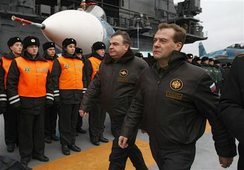 梅德韋杰夫10月11日在巴倫支海域視察了俄北方艦隊(duì)“庫(kù)茲涅佐夫海軍元帥”號(hào)航空母艦,并在這艘航母上觀摩了代號(hào)為“德維納”的艦隊(duì)軍事演習(xí),演習(xí)中一艘核潛艇成功試射了一枚洲際彈道導(dǎo)彈。本次演習(xí)是在正在進(jìn)行“穩(wěn)定-二00八”首長(zhǎng)司令部戰(zhàn)略演習(xí)框架內(nèi)實(shí)施的。