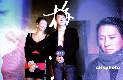 10月21日,章子怡、黎明合作演唱電影《梅蘭芳》主題曲MV北京發(fā)布會上,兩人為《梅蘭芳》電影海報(bào)揭幕。中新社發(fā) 廖攀 攝