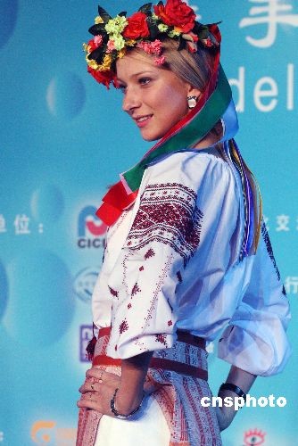 10月23日晚,在北京舉行的2008新絲路世界模特大賽上,各國參賽選手進行才藝展示。圖為參賽選手展示民族服裝。中新社發(fā) 錢興強 攝